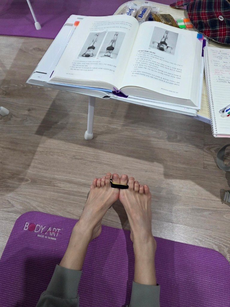 RYTK300 지도자과정 10월 26일 수업에서는 Halasana와 Sarvangasana의 해부학적 정렬, 흉추 백아웃, 무지외반증 교정, 그리고 고무밴드를 활용한 정렬 감각 훈련을 진행했습니다.